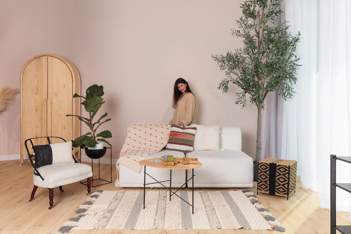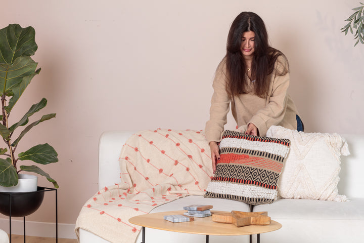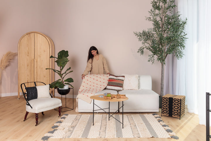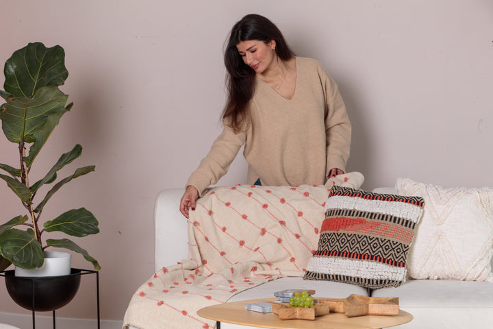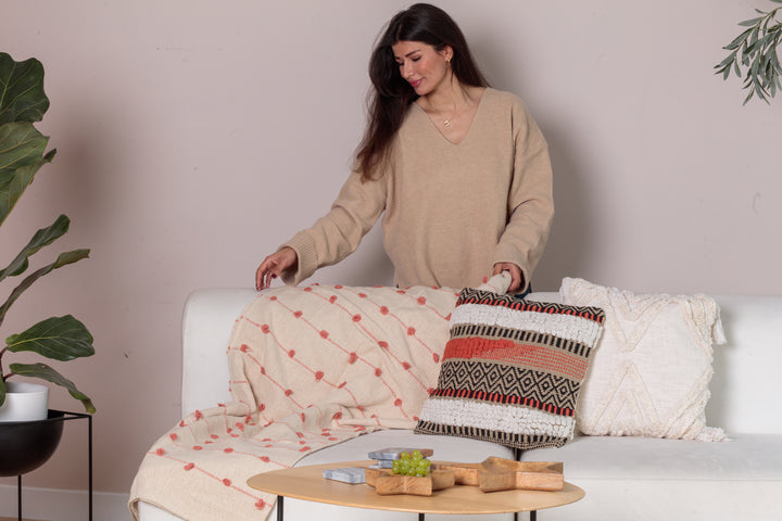 The Rajani is a neutral handwoven coral tufted throw .