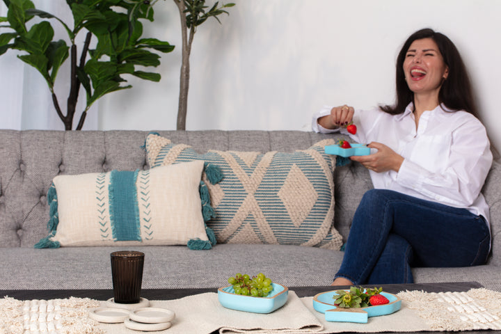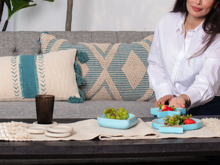 Breathe softness and serenity into your space with the Powder Blue Set — a soothing blend of texture, tone, and natural warmth. This thoughtfully curated collection includes two plush cushions in delicate shades of powder blue and beige, paired with beautifully crafted wooden bowls painted in a soft, matte blue finish.