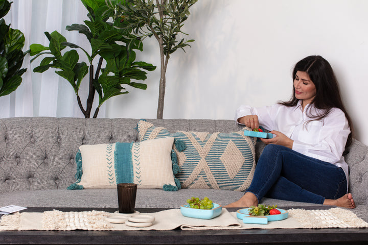 Handcrafted by skilled artisans in Jaipur, the cushion cover boasts modern elegance, making it a perfect addition to contemporary living spaces. The meticulous weaving process, requiring precision and coordination, imparts an exclusive touch to each piece. Discover the perfect blend of style and traditional artisanal excellence with this tailored cushion cover, a true reflection of passion and expertise. This offering is brought to you by a brand whose quality control unit works hard to ensure that there are no misses with regards to design, quality, and finish